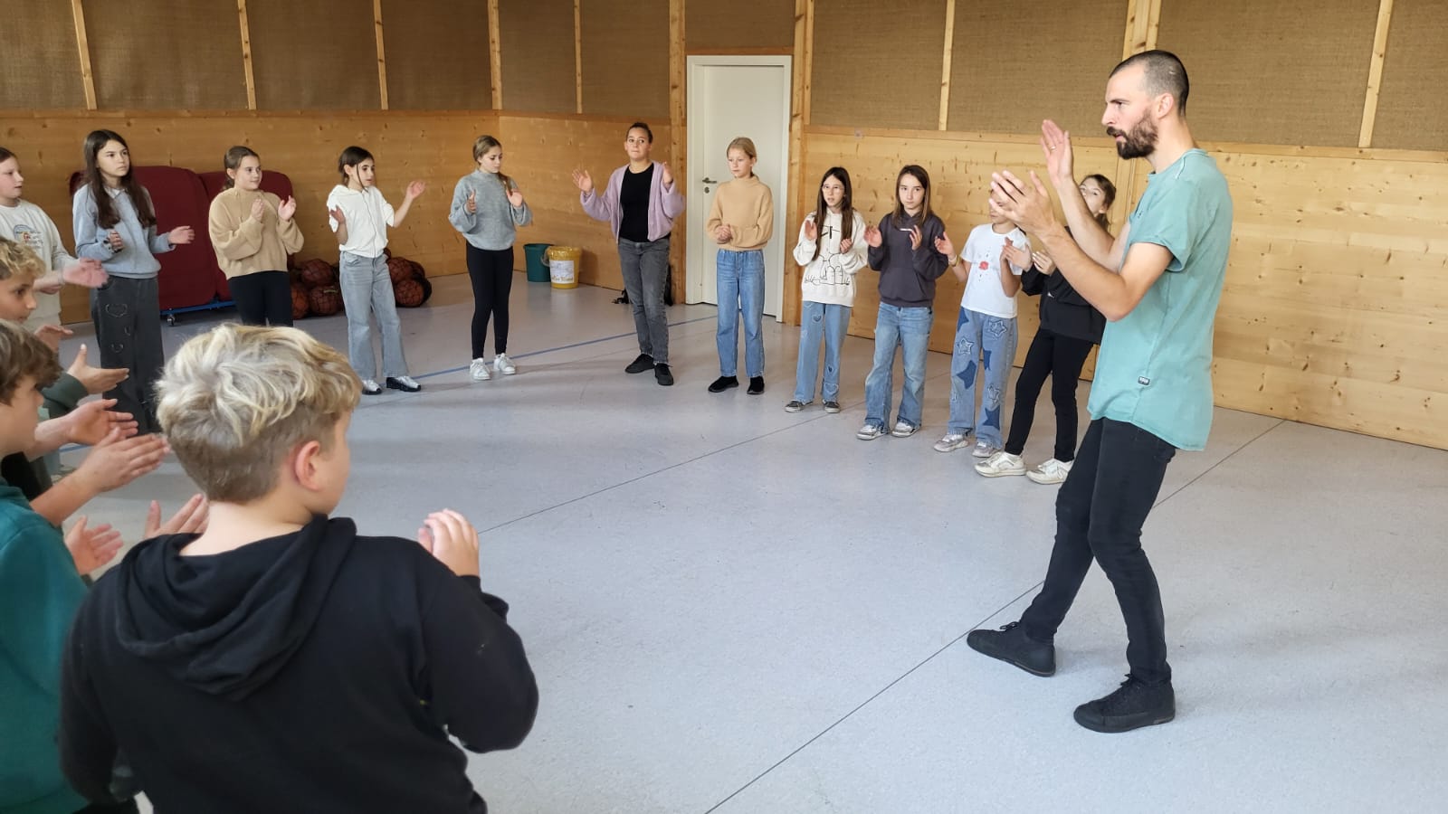 Der Perkussionist Dominik Schad begeisterte Schülerinnen und Schüler aller Klassenstufen mit seinem energiegeladenen Workshop. Mit Bodyperkussion erlebten alle hautnah, was Rhythmus bedeutet und wie er uns in Bewegung setzt.