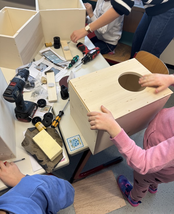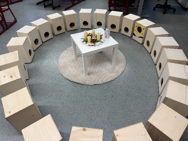 Ein besonderes Projekt sorgte in den Klassen 3a und 3b für Begeisterung: Die Schülerinnen und Schüler bauten gemeinsam mit ihren Eltern eigene Cajons. Möglich wurde diese Aktion durch die Unterstützung von Robert Gruber aus Christazhofen, dem Schulförderverein sowie der Fachschaft Kunst. Die selbstgebauten Cajons sind nun fester Bestandteil des Schulalltags. Im Kunstunterricht werden sie noch gestaltet, um sie dann im Musikunterricht erklingen zu lassen. Außerdem dienen die Cajons nun als Sitzgelegenheiten im Sitzkreis.